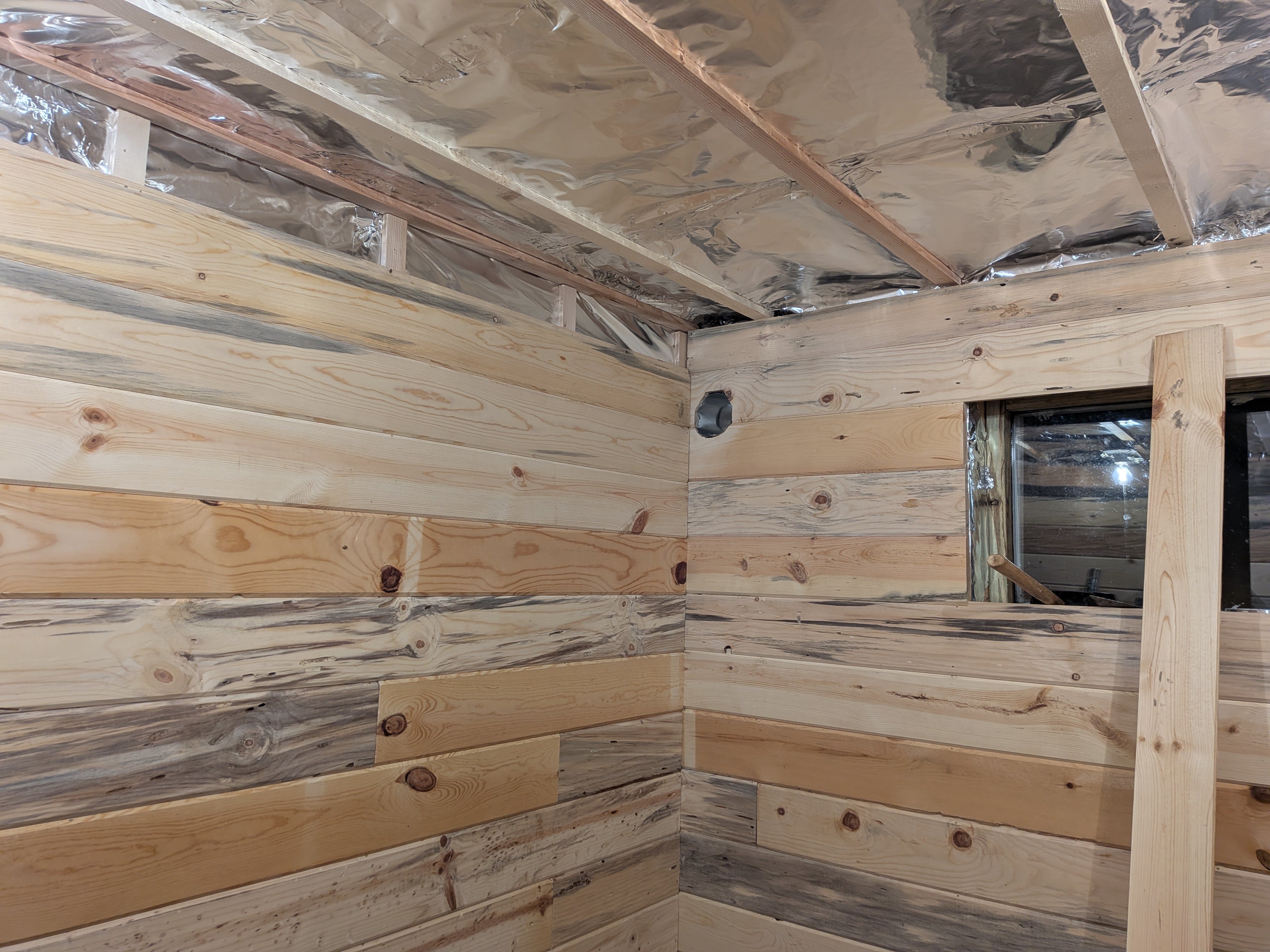 The vapor barrier was covered with pine panels